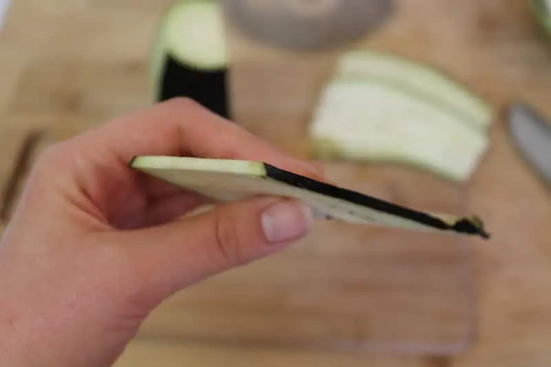- Thinly slice the eggplant and zucchini lengthwise (see photo below for example). Sprinkle salt over the slices and place salt side down on a paper towel. Sprinkle salt on the other side of the slices and let sit for about 10 minutes. This will draw the water out of the eggplant and zucchini.
